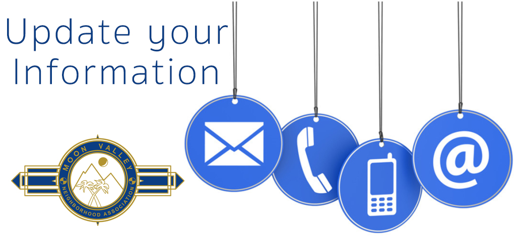 Staying connected with our Moon Valley residents is vital to keeping our neighborhood safe, informed, and thriving. By providing us with your updated contact details, including email addresses and phone numbers, we can: